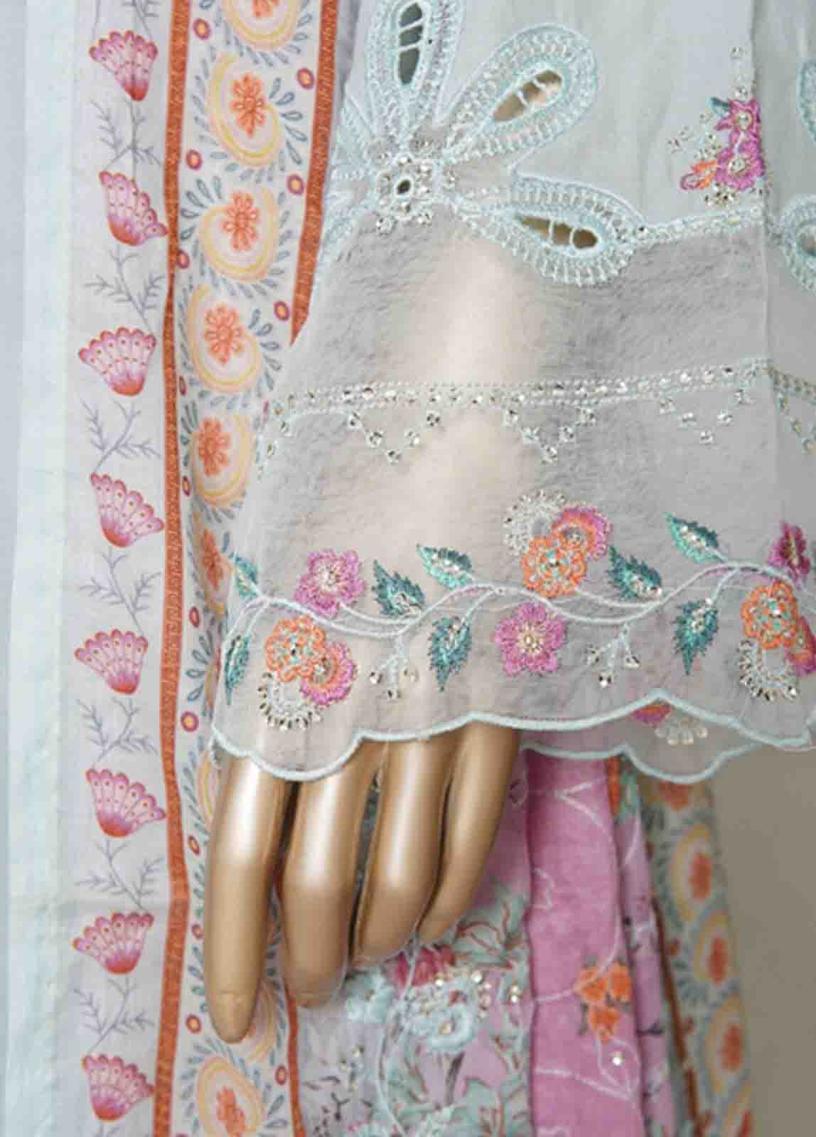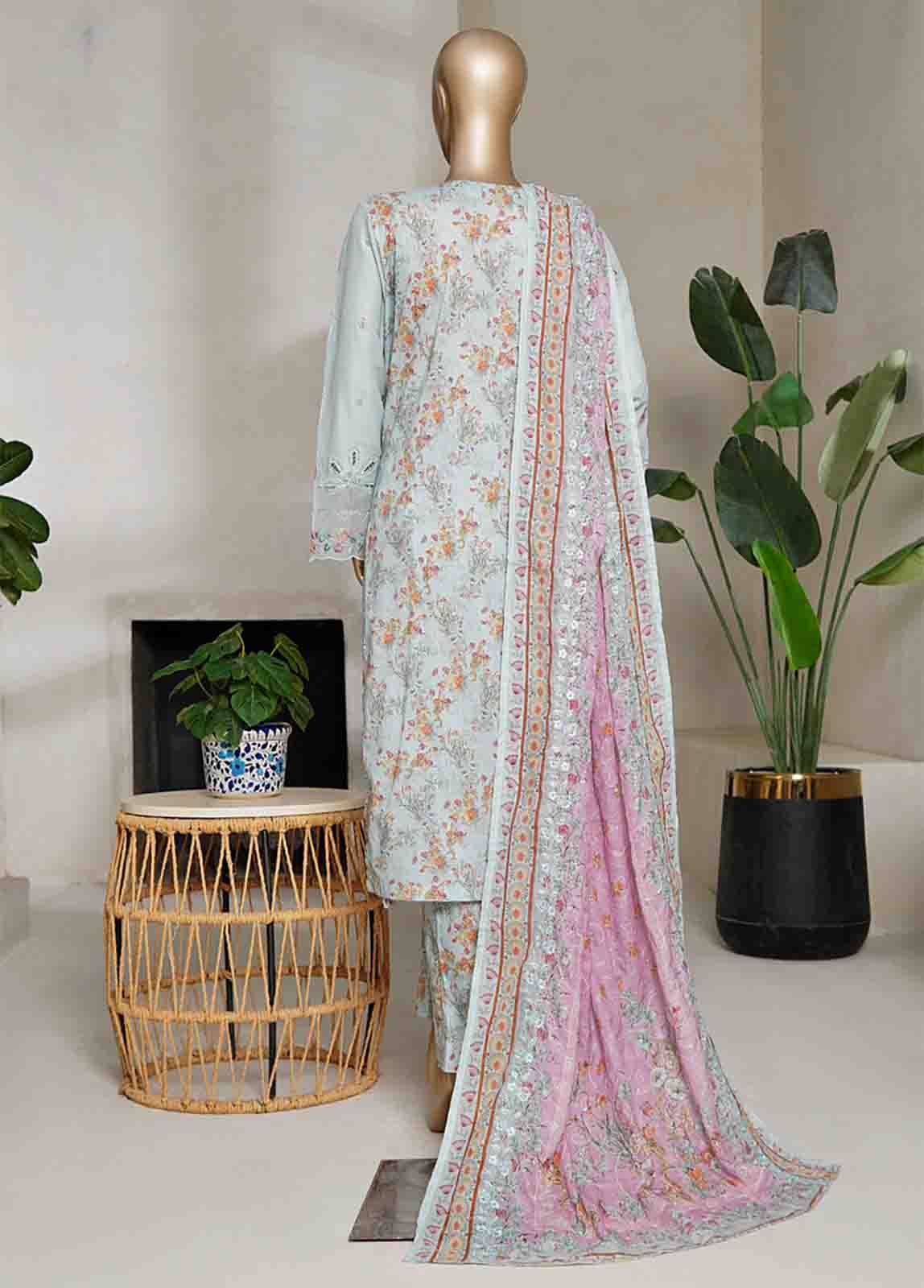 3 Piece Pastel Blue Color Embroidered Cotton Stitched Suit with Embroidered Cotton Dupatta and Prined Trouser